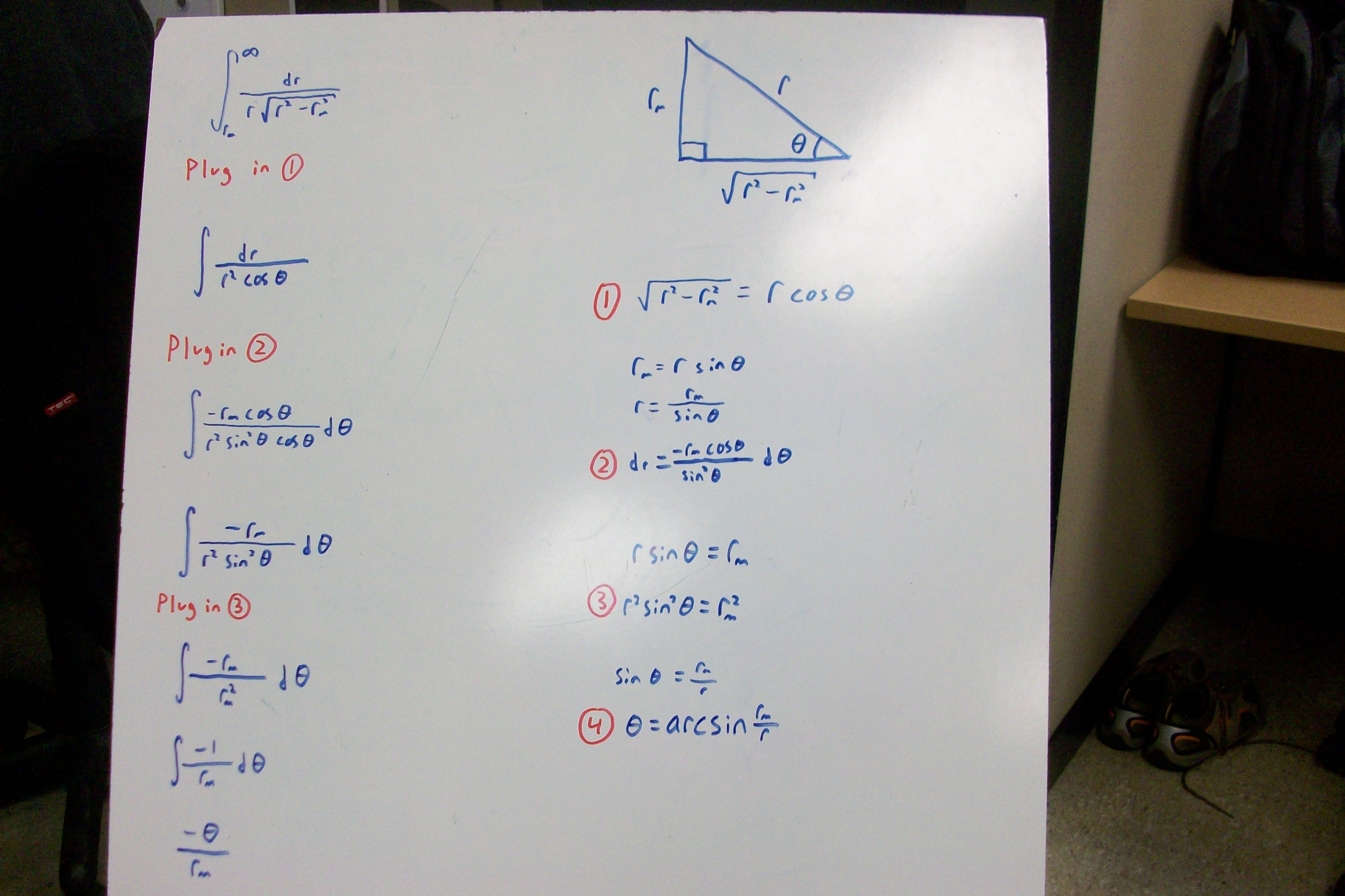 Written by my friend Max Junda. He looked up an integral in a table, while I did it by hand with a trig substitution. A photo of the integral on my whiteboard is included as an extra file.